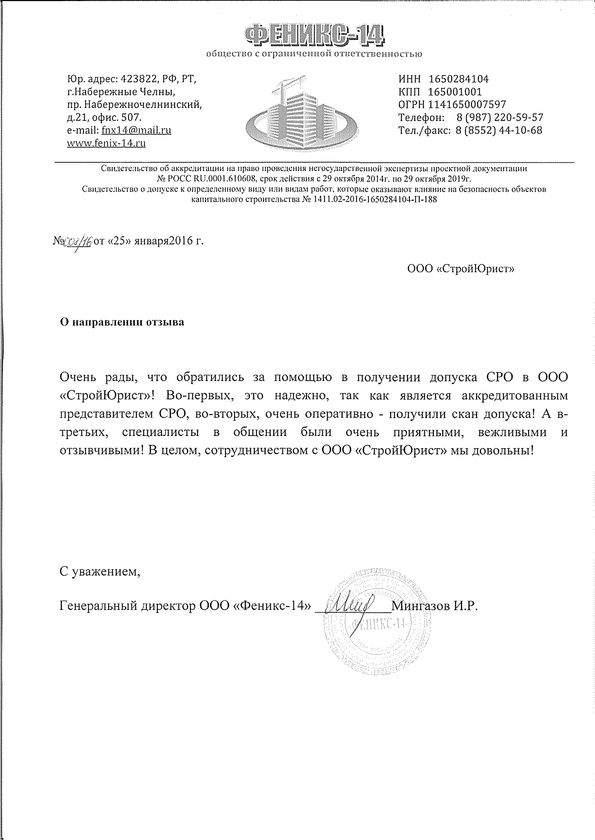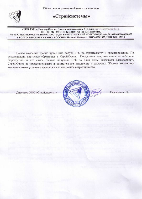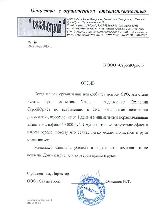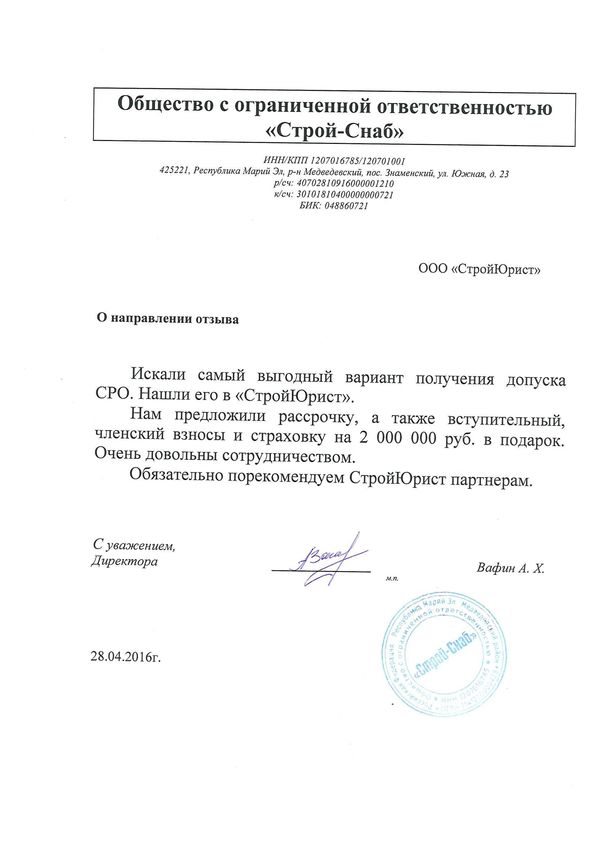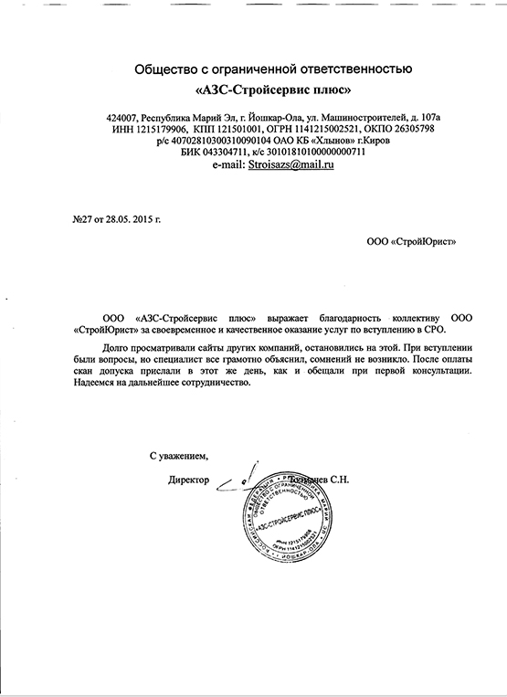 Отзывы клиентов "СтройЮрист" по вступлению в СРО в Сарапуле