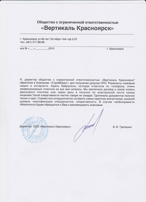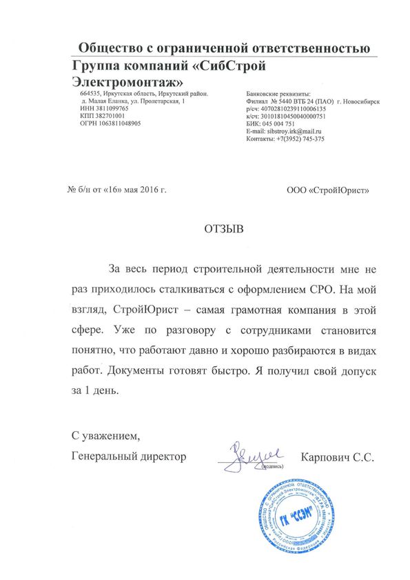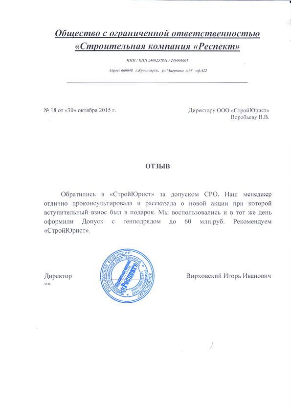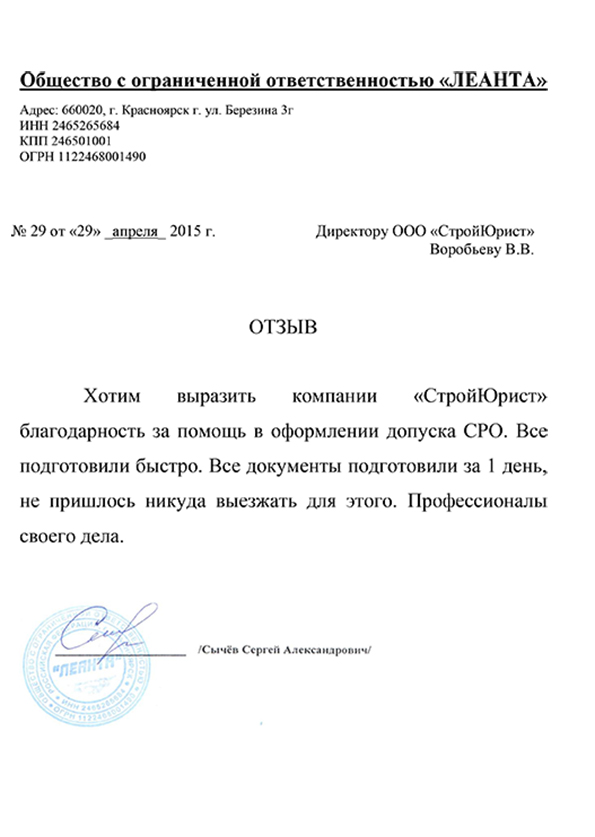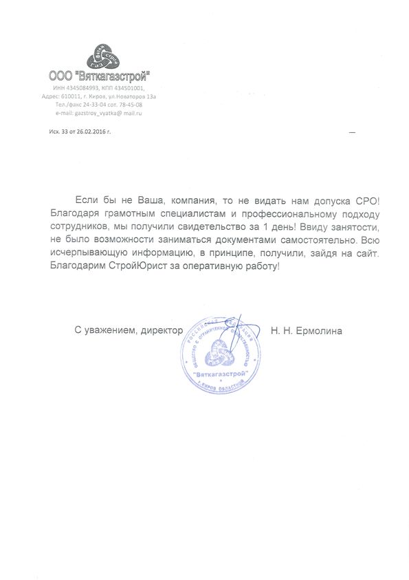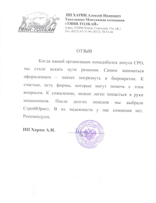 Отзывы клиентов "СтройЮрист" по вступлению в СРО в Сарапуле