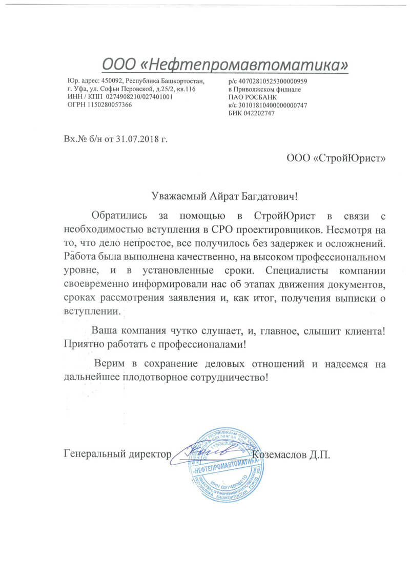 Отзывы клиентов "СтройЮрист" по вступлению в СРО в Сарапуле